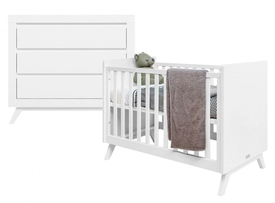 Deze 2-Delige babykamer van de serie Anne bestaat uit een ledikant en een commode met 3 laden. Deze babykamer heeft ranke schuine pootjes en greeploze lade. De bodem van het bed is in hoogte