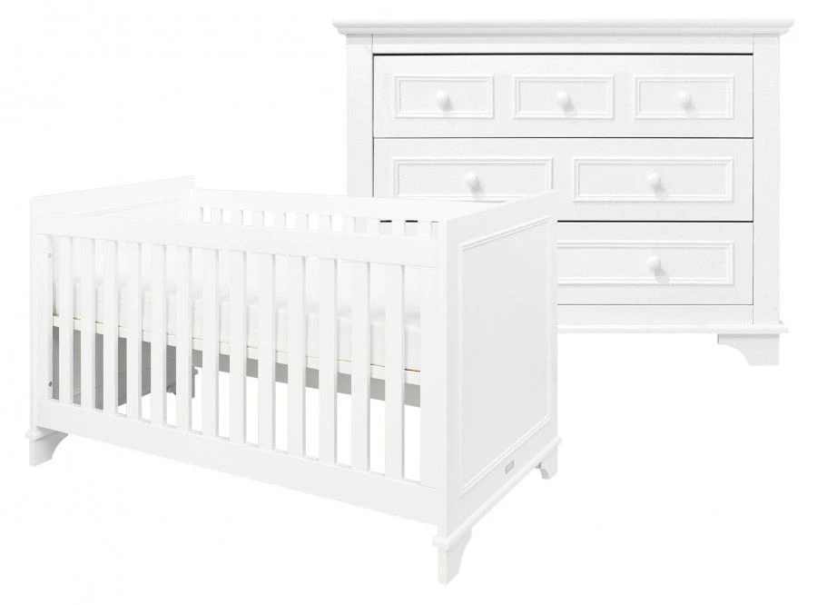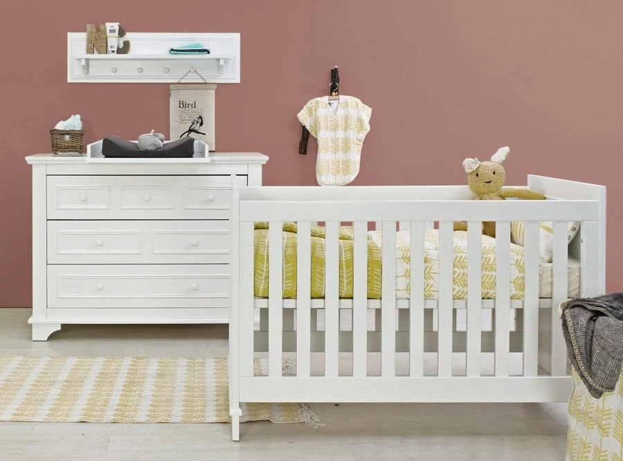 Babykamer Charlotte heeft een klassieke uitstraling door de sierlijsten op de meubelpanelen van het ledikant en de commode. De MDF meubelen zijn wit gelakt, de lak is op waterbasis dus kindvriendelijk. Deze 2-delige babykamer bestaat uit een ledikant en commode. Het ledikant wordt geleverd inclusief verstelbare lattenbodem.