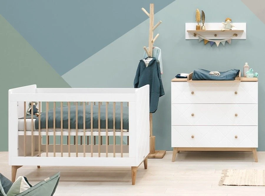 Bopita 2-Delige babykamer van de serie Paris kenmerkt zich door de diagonale groeven in de meubelpanelen en de eiken poten. De 2-delige babykamer bestaat uit een ledikant en een commode. De bodem van het ledikant is in hoogte verstelbaar. Zodra het kind groter wordt, of zichzelf kan optrekken aan de spijlen, kan je de bodem verlagen. Zo blijft het bed een veilige plek. Combineer deze kamer met bijvoorbeeld het wandelement van Paris. Zo creëer je eenvoudig nog meer opslagruimte boven de commode.