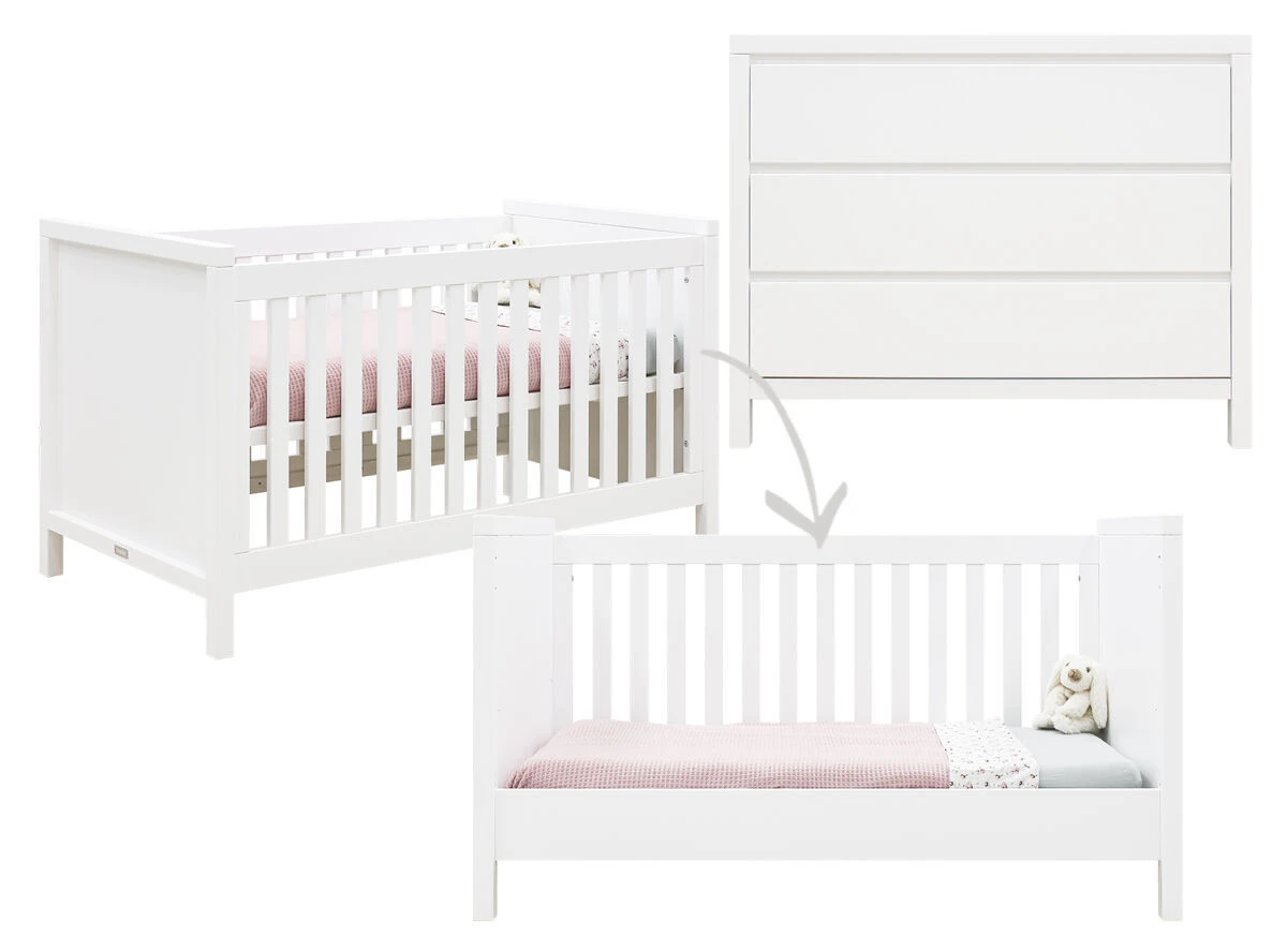 Ben je opzoek naar een moderne babykamer die in elk interieur past en met je kindje mee kan groeien, dan past Bopita meegroei babykamer Corsica helemaal bij jou. De 2-delige babykamer bestaat uit een ledikant en commode.