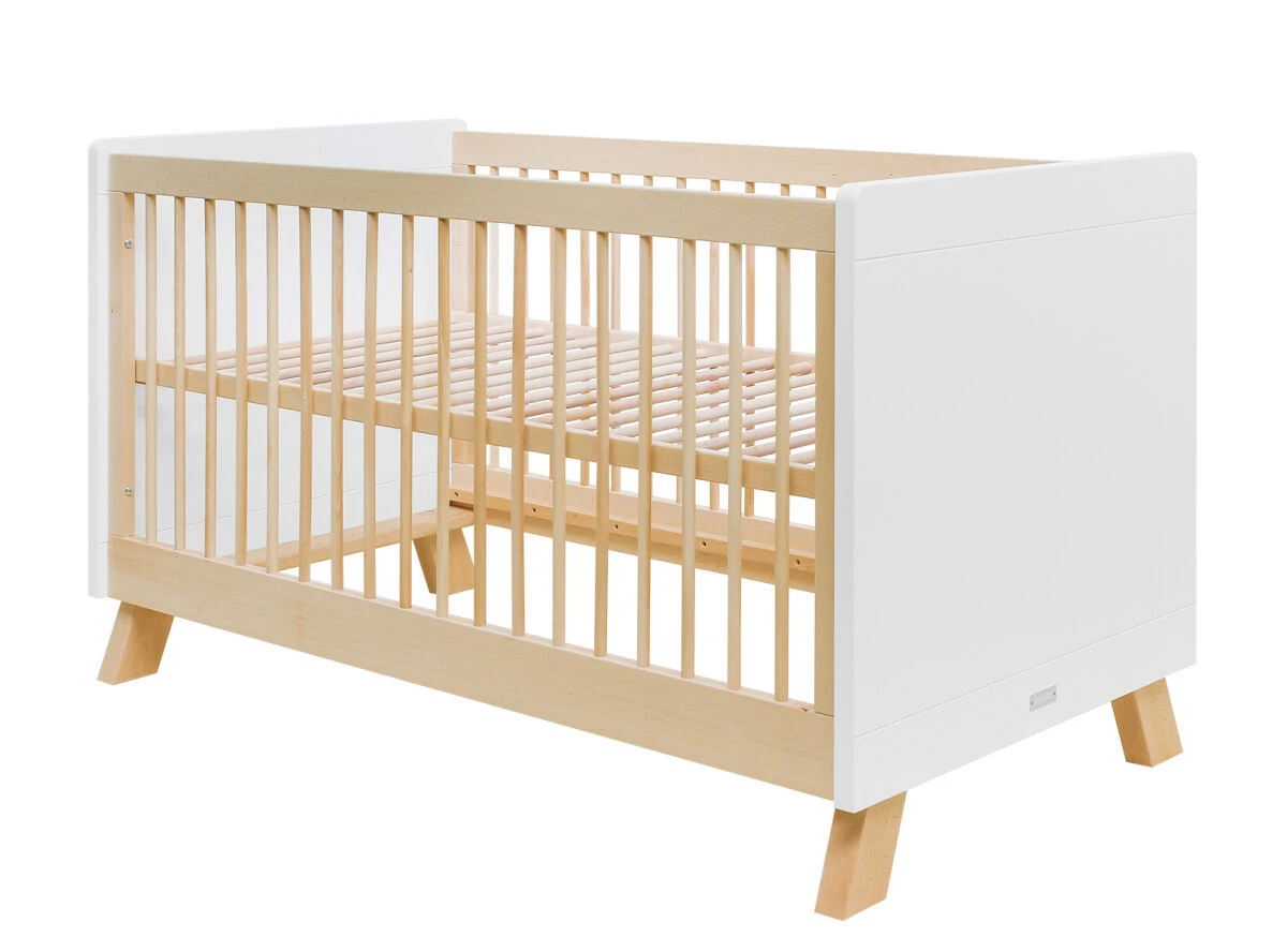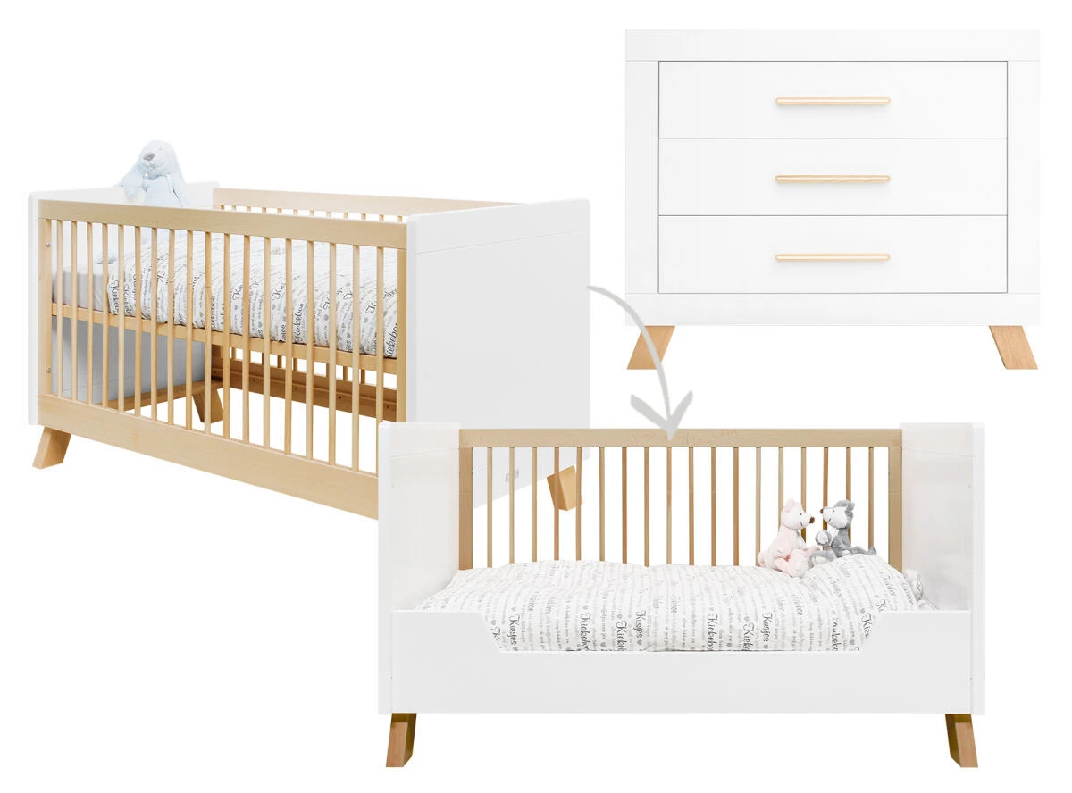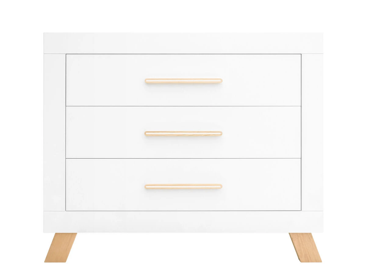 De Bopita 3-Delige babykamer van de serie Lisa kenmerkt zich door het scuine beuken houte pootjes en wit afgelakte panelen. De bijpassende handgrepen maken het geheel af. De 3-delige babykamer