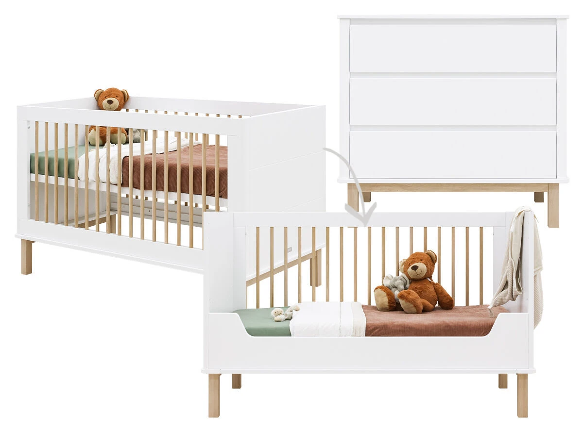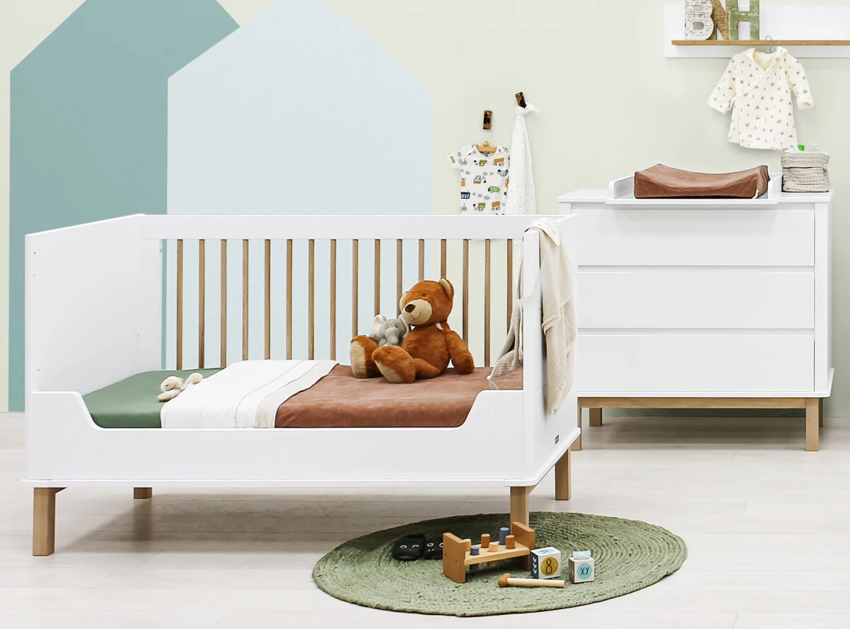 Deze prachtige 3-delige Bopita Mika babykamer in Scandinavische stijl past in elk kamertje. De set bestaat uit een ledikant en commode.