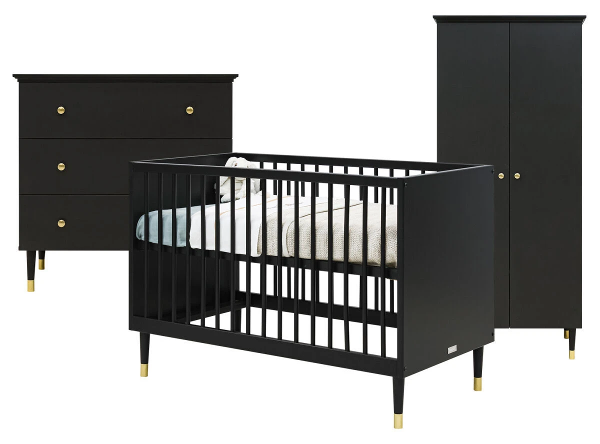 De Bopita 3-delige babykamer bestaat uit een ledikant, commode en 2-deurskast. De kamer heeft een warm luxe uitstraling dankzij de gouden accenten. De pootjes en deurknopjes van de kast hebben warm gouden kleur.