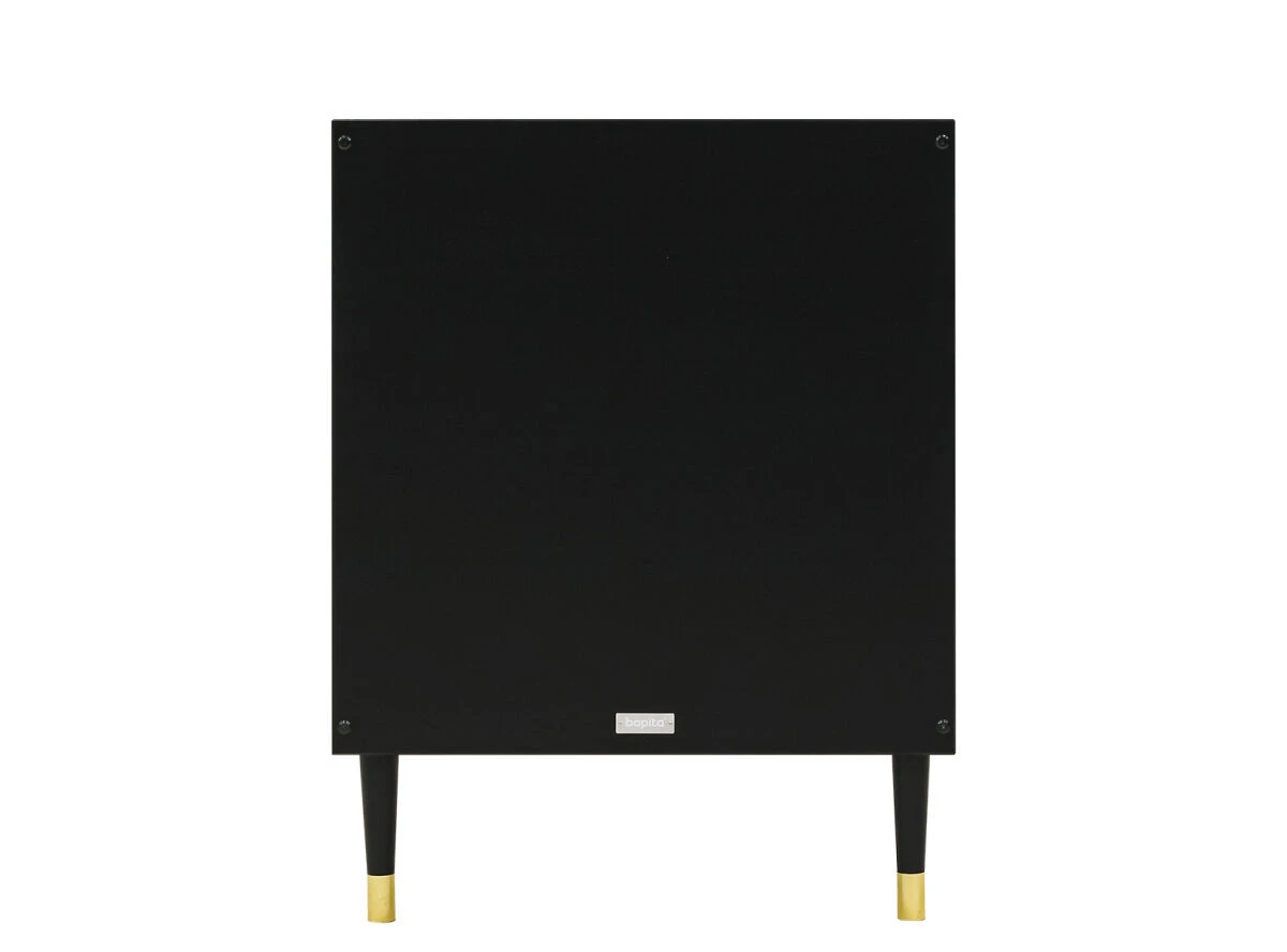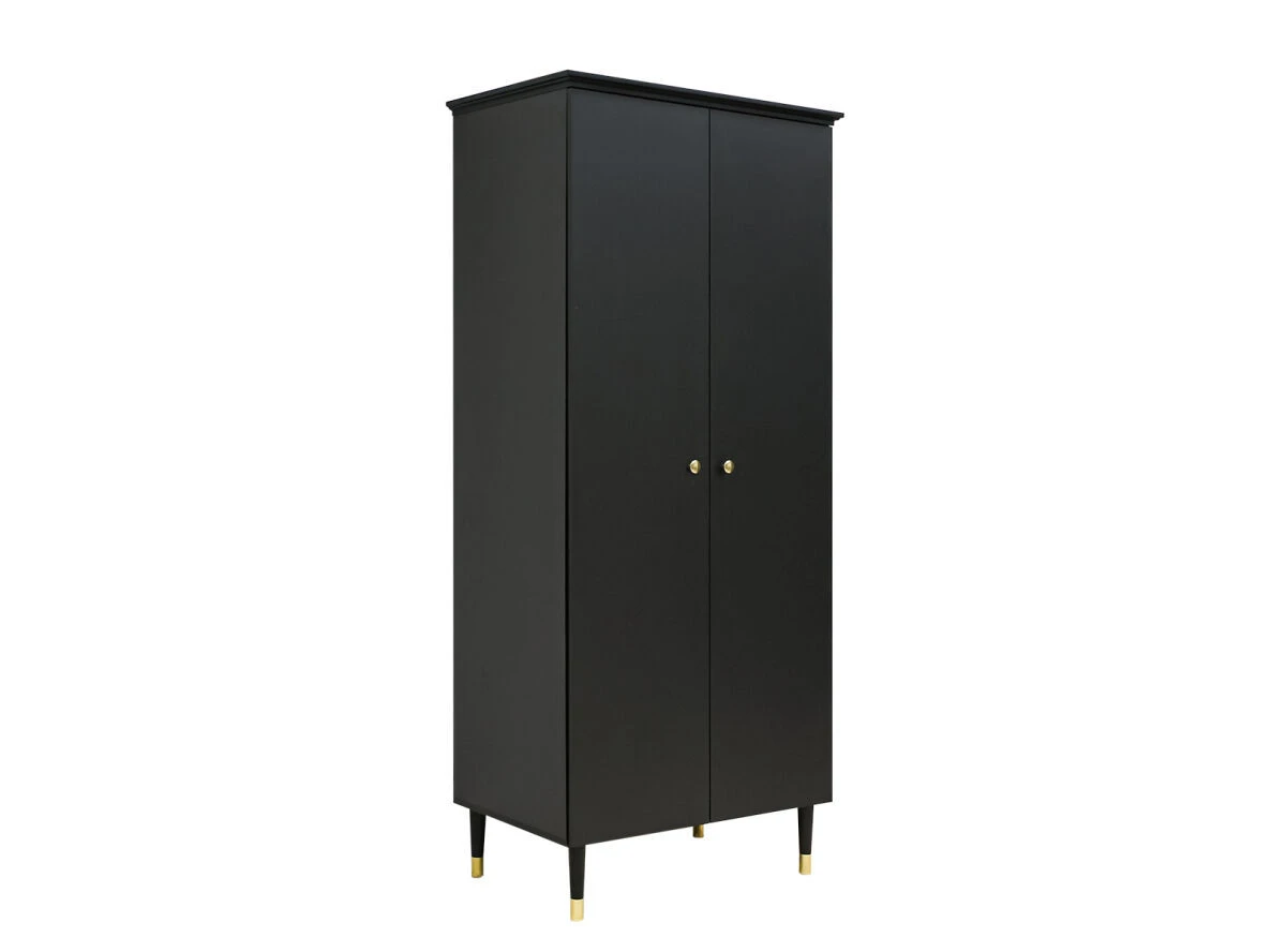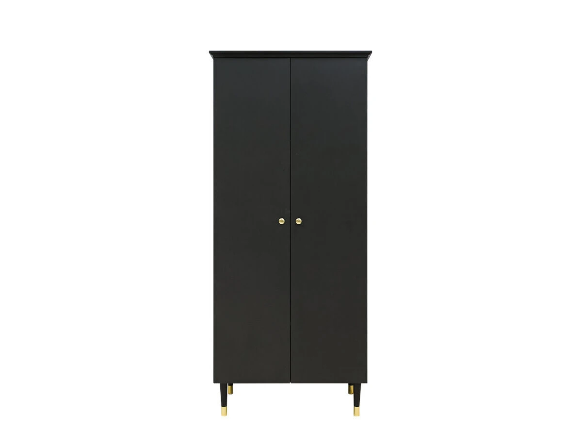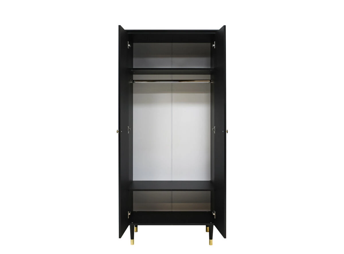 De pootjes en de handgrepen van de kast zijn goud. De kast zelf is afgewerkt met een lak in de kleur mat zwart. Het interieur bestaat uit een brede hangroede en verschillende legplanken waarvan de meeste planken in hoogte verstelbaar zijn.