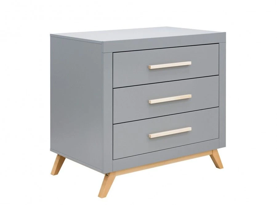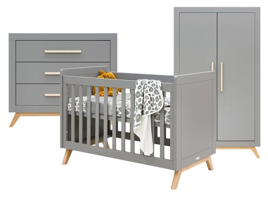 Bopita 3-delige babykamer van de serie Fenna. Deze babykamer bestaande uit een bed 60 x 120 cm, een commode met 3 laden en een 2-deurskast. Deze babykamer heeft een Scandinavische / eigentijdse uitstraling door de combinatie van grijs en naturel gelakte houten accenten. Het ledikant wordt geleverd inclusief verstelbare lattenbodem. Zodra het kind groter wordt, of zichzelf kan optrekken aan de spijlen, kan je de bodem verlagen. Zo blijft het bed een veilige plek.