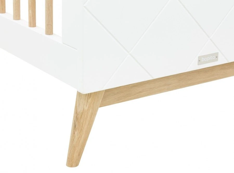 Bopita 3-Delige babykamer van de serie Paris kenmerkt zich door de diagonale groeven in de meubelpanelen en de eiken poten. De 3-delige babykamer bestaat uit een ledikant, commode en een