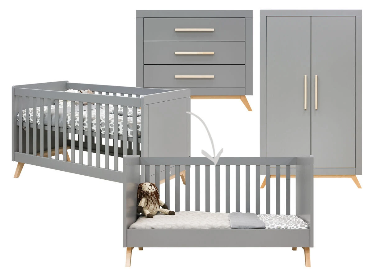 Bopita 3-delige babykamer van de serie Fenna. Deze babykamer bestaande uit een bed 60 x 120 cm, een commode met 3 laden en een 2-deurskast. Deze babykamer heeft een Scandinavische / eigentijdse