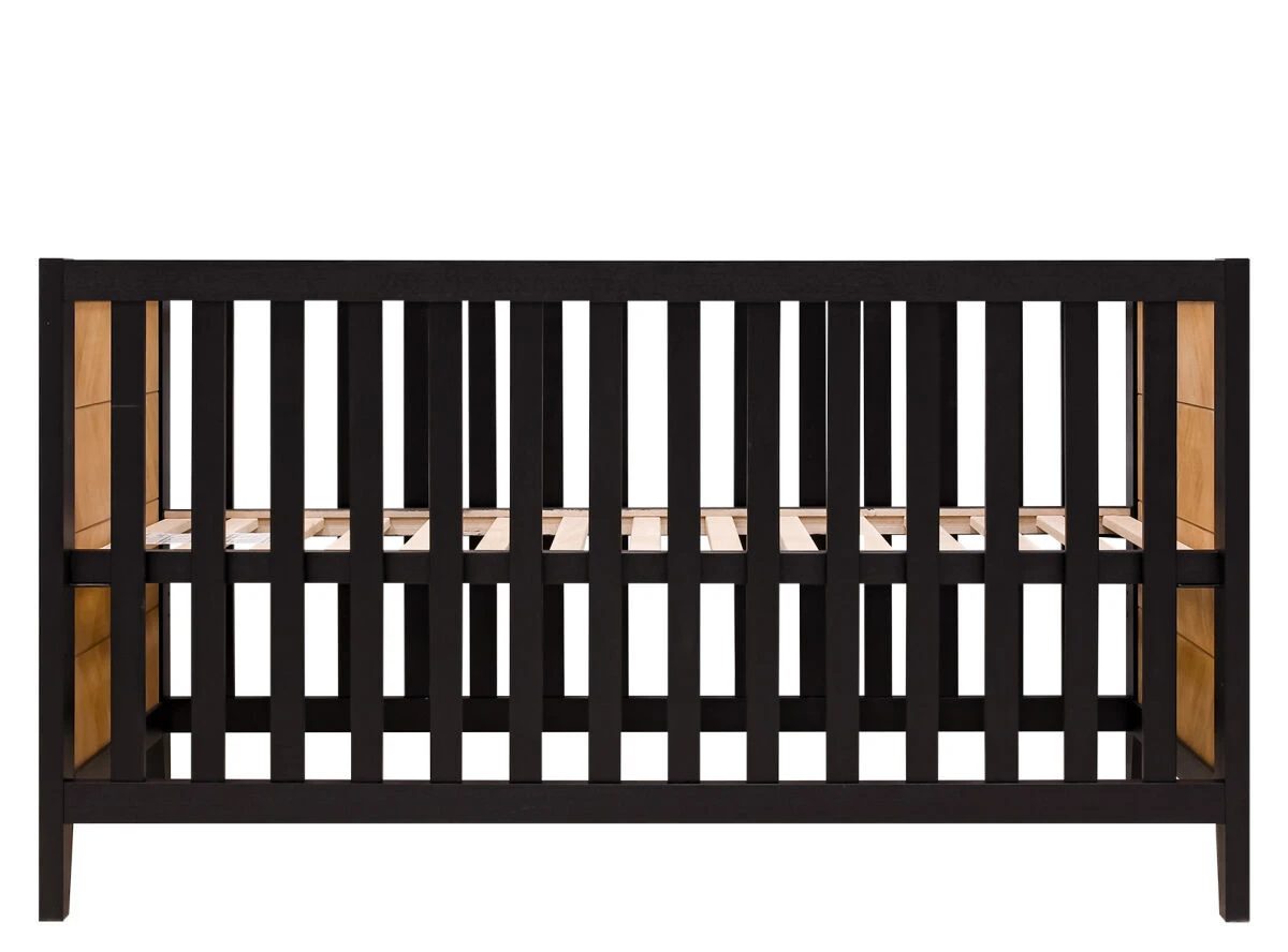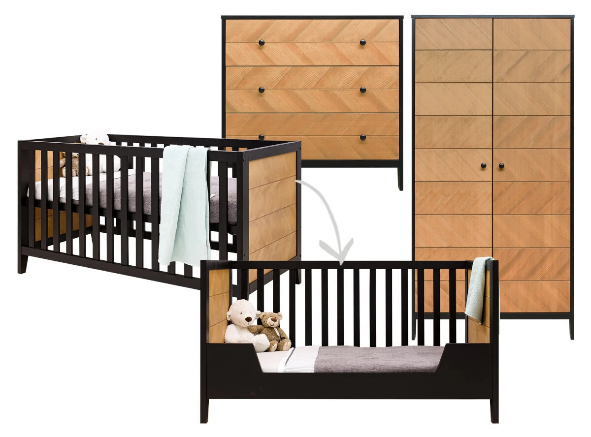 Bopita 3-Delige babykamer van de serie Job kenmerkt zich door de combinatie van mat zwart en gefineerd hout in visgraat motief. De 3-delige babykamer bestaat uit een ledikant, commode en