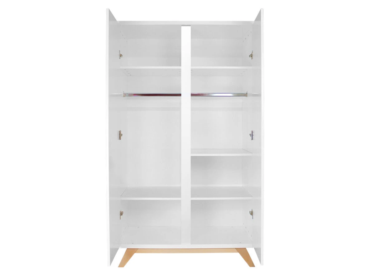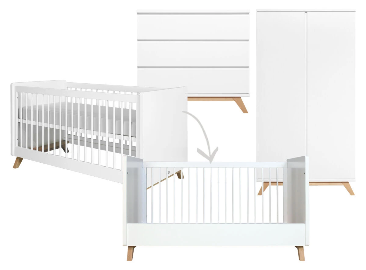 Bopita 2-Delige meegroeikamer van de serie Lynn Greeploos kenmerkt zich door de strakke lijnen en beuken houten pootjes. Hierdoor heeft de meegroeikamer een eigentijdse Scandinavische look. De 3-delige meegroeikamer bestaat uit een ledikant, een commode en kledingkast. Wanneer de baby zichzelf kan optrekken aan de spijlen van het bed, kan je de bodem van het bed zakken. Daardoor blijft het bed een veilige plek om te slapen. In de kast en de commode vind je voldoende opbergruimte voor kleertjes en spulletjes. Combineer deze babykamer met bijvoorbeeld het wandrek van dezelfde serie.