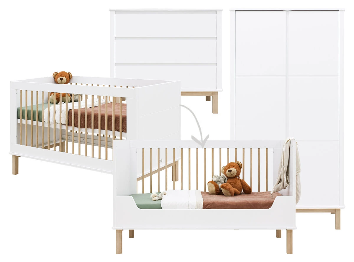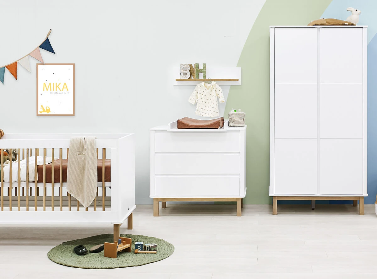 Deze prachtige 3-delige Bopita Mika babykamer in Scandinavische stijl past in elk kamertje. De set bestaat uit een ledikantje, commode en kledingkast.