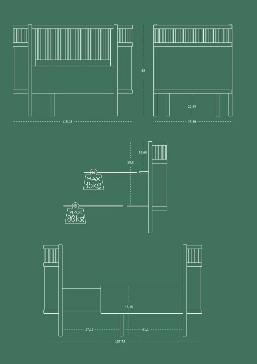 Op de hoogste stand is het maximale draaggewicht 15 kg. en op de laagste stand 80 kg. Het bed is verlengbaar tot 155 cm.